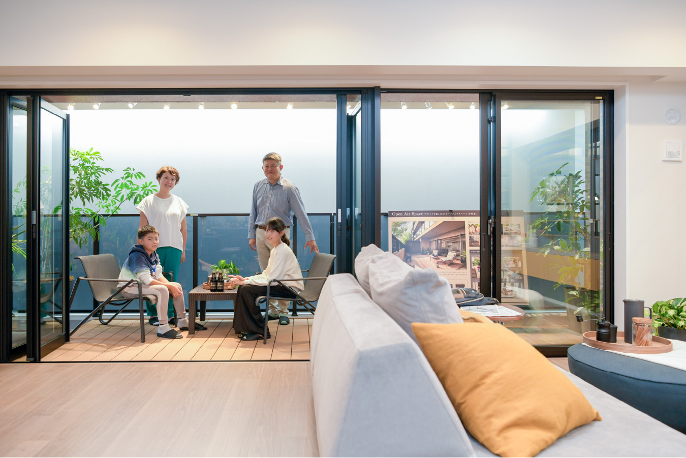 Y家が選ばれたお部屋は「海」が見える広い3LDK。「バルコニーにウッド調デッキが敷かれたオープンエアスペースがあります。ここにアウトドア用のテーブルセットを置いて、海を眺めながら食事をするのが楽しみです。」とご主人。奥行きのある天然御影石のキッチンカウンターは奥様のお気に入り。「広々として高級感があり、ちょっとした食事ならここでできます。」リビング脇に仕切られた2.4畳の「マルチルーム」は、ご家族みんなの「勉強スペース」にされるそうです。「こういう空間があると、子どもたちの勉強を見てあげたり、様々な使い道があって便利ですね。」