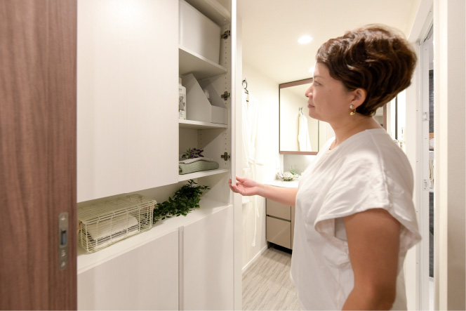 早めに購入を決めて、いろいろオプションを申し込もうと考えていたご夫妻ですが、このマンションには欲しい設備や仕様が予め施されていたので、その必要はなかったそうです。「特に収納が充実していると感じました。洗面室にも、大きなリネン庫や洗濯機上の吊戸棚などが標準仕様で設置されていますし、ウォークインクローゼットの大きさにも驚きました。収納が多いだけでなく、それぞれ使い勝手が工夫されている点も嬉しいですね。」暮らし慣れた街に生まれる真新しいマンションは、Y家のご家族と共に時を重ねながら、ご家族4人が笑顔になれる素敵な時間をたくさん作ってくれることでしょう。