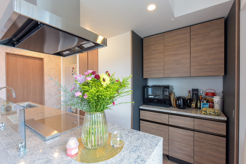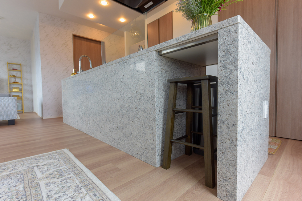 「アイランドキッチンはなかなかないので、一目で気に入りました。フィオレストーンの天板は高級感があって、お掃除も簡単。タッチレス水栓も便利です。」と奥様。ところでこのキッチン、普通のご家庭にあるものがないような。そう、キッチン家電が見当たりません。「実は、扉の中に。このキッチン収納は標準装備でした。ゴミ箱もカウンター下に収まるので邪魔にならず、見た目もすっきりして良いですね。ゴミ箱置き場のリビング側には椅子を置いています。ピッタリサイズのゴミ箱と椅子を探すのには苦労しましたが。」と笑うご主人。その甲斐あって、生活感のない見事なキッチンスペースに仕上がっています。