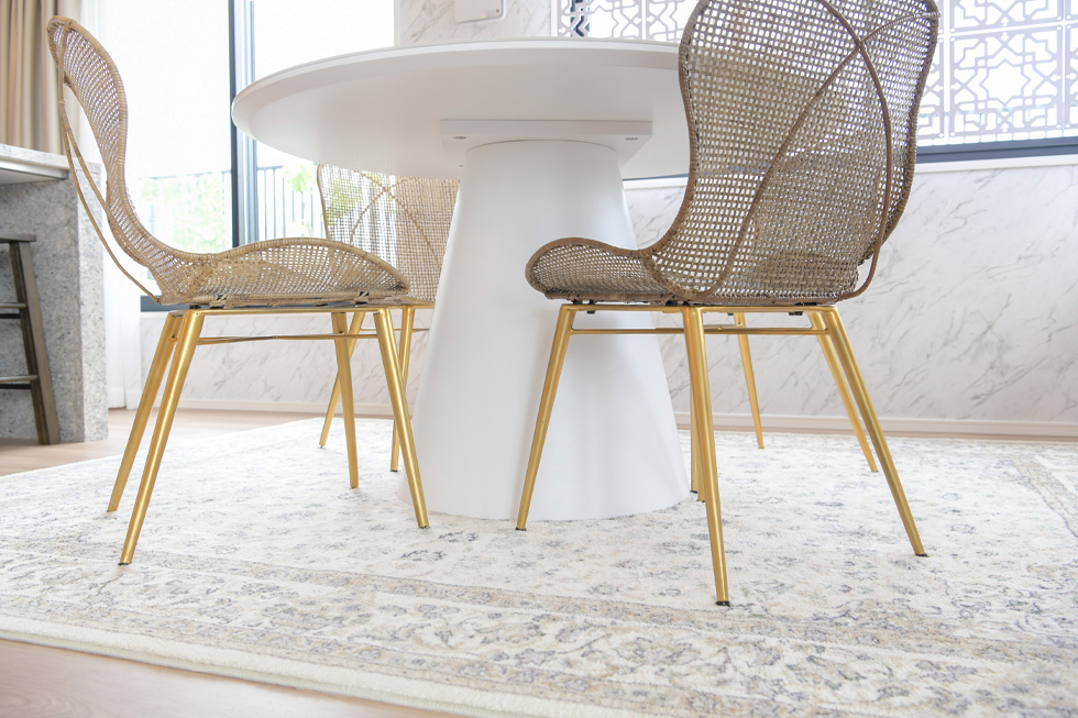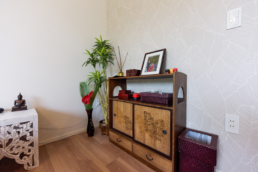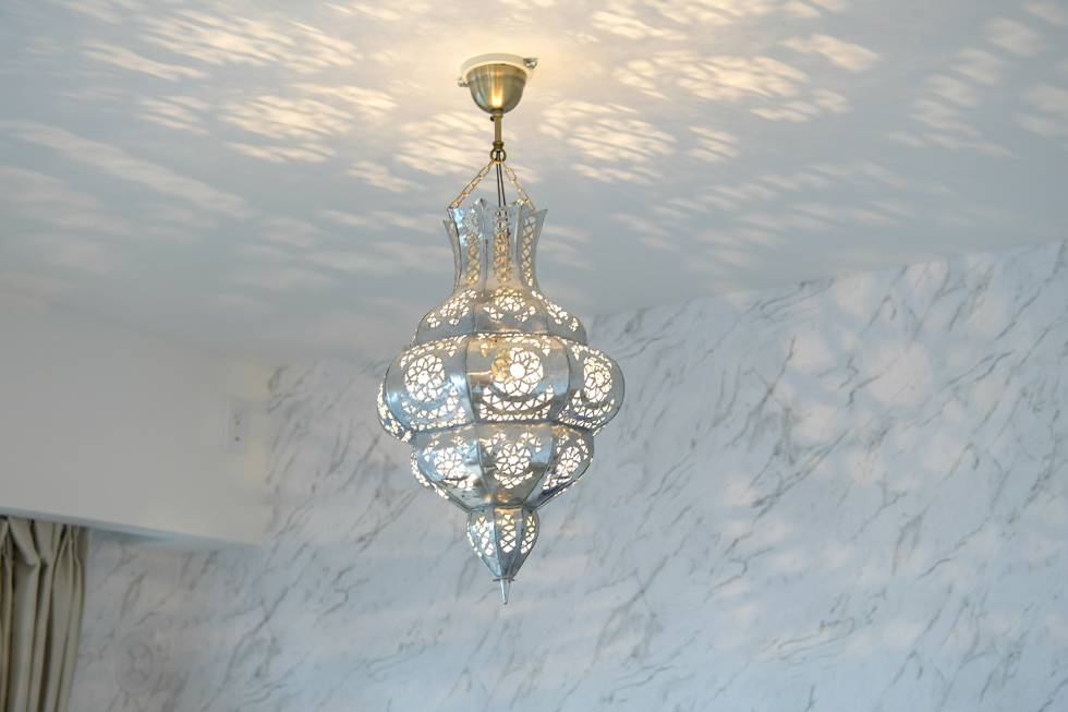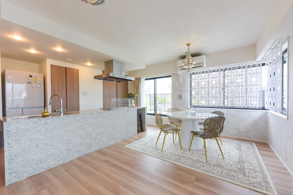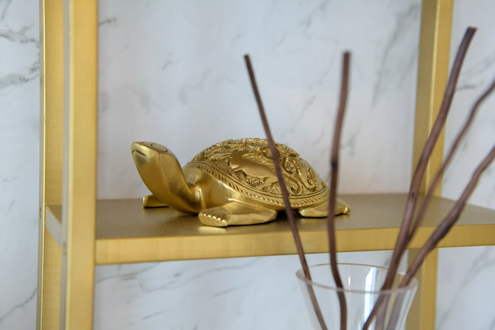 キッチンからリビング・ダイニングスペース、さらには家具や小物、照明器具に至るまで、統一感のあるインテリアで美しくコーディネートされているH邸。ご入居時に全て新調されたのかと思いましたが、「スプレー塗料を使って、自分たちで色を変更しました。」と驚きの発言が。「以前の部屋はアジアンテイストでまとめていたので、茶系のモノが多かったんです。そこで、ダイニングチェアの脚、ワニの長椅子、本棚、亀の置物などはゴールドに、ソファの枠組みは白に、茶系の木製部分を塗装し直してみました。」ご夫妻のセンスの良さもさることながら、プロ顔負けのDIY技術に、ただただ感心するばかりです。
