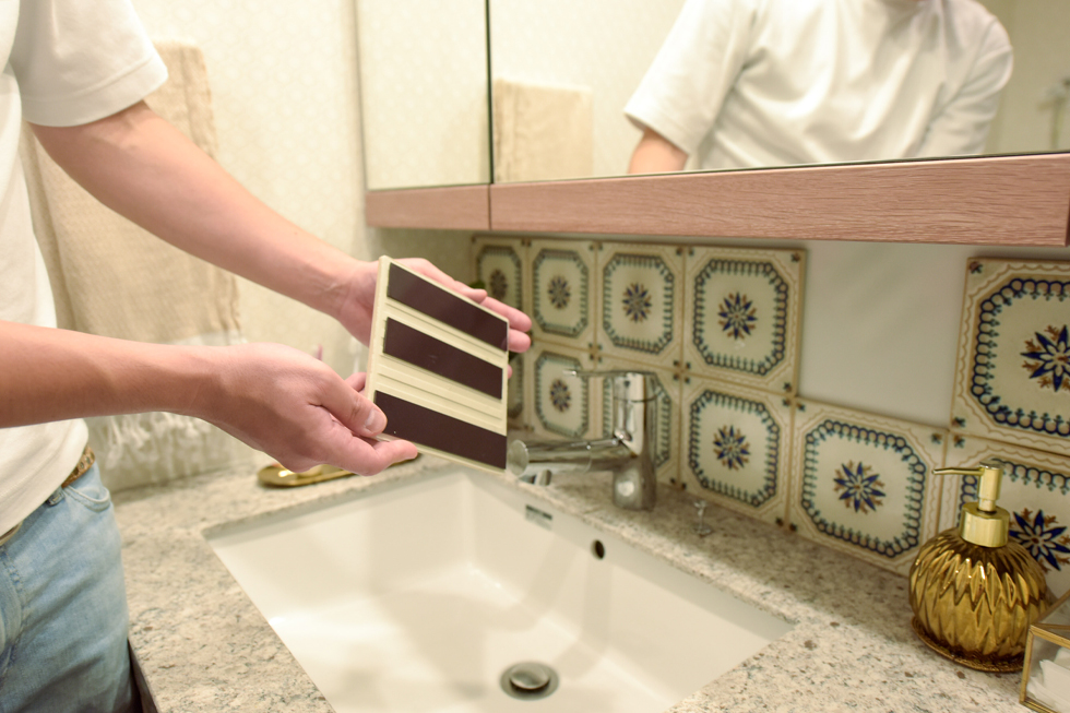 洗面化粧台にも、ぜひ参考にしたい飾り付けが。「三面鏡下の壁面がマグネット対応だったので、マグネット式のタイルを貼っています。」専有部を取り囲むように配置された広いバルコニーのグリーンコーディネートも素敵。室内からも見える清々しい緑に心が癒され、都会の真ん中にいることを忘れてしまいそうです。そんなご夫妻に高評価をいただいたのは、マンション共用部。「ロビーに飾られているアートフラワーが、入居して少ししたら変わりました。季節ごとにお花が変わるんですね。外構の夜間照明も綺麗ですし、ホテルのような内廊下も気に入っています。」しばし日常を離れて、優雅な気分に浸れるH邸でした。