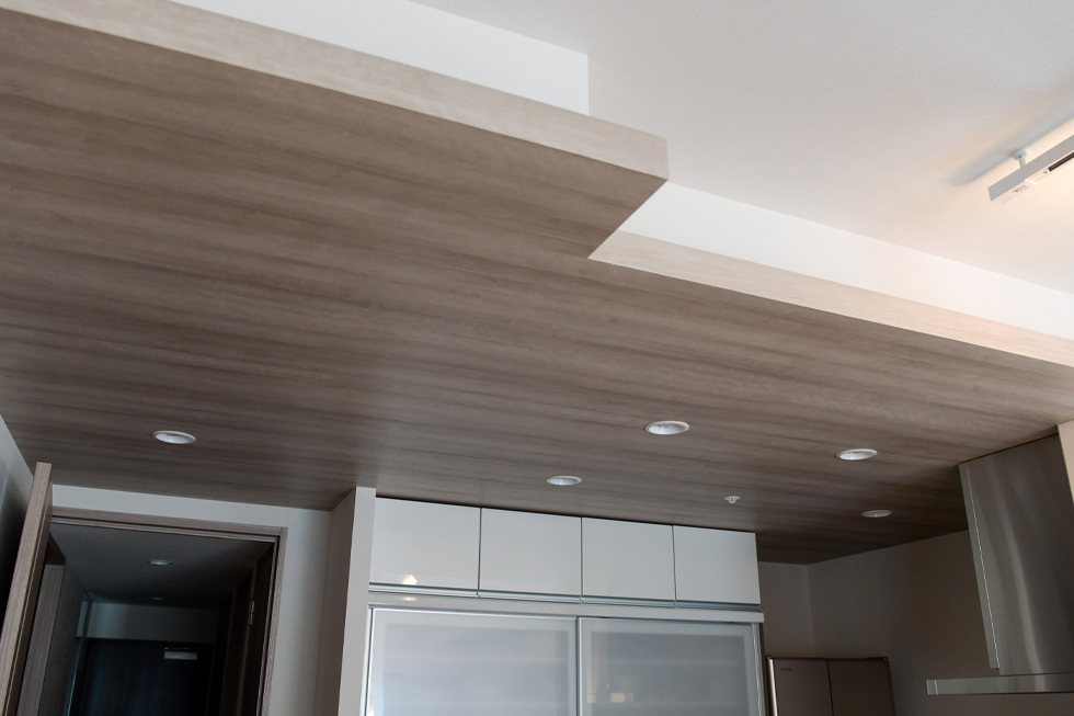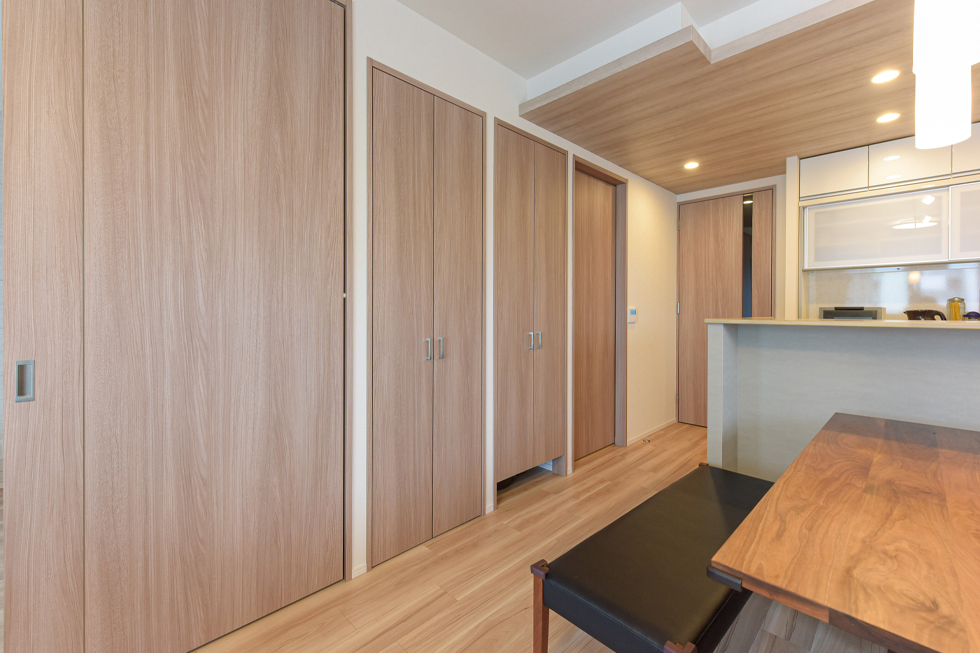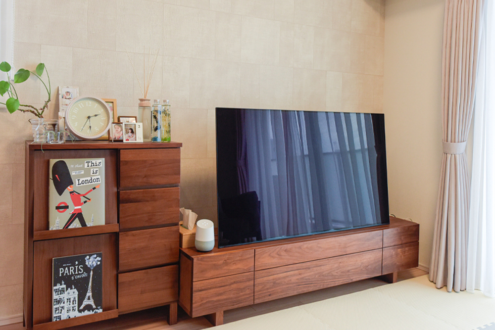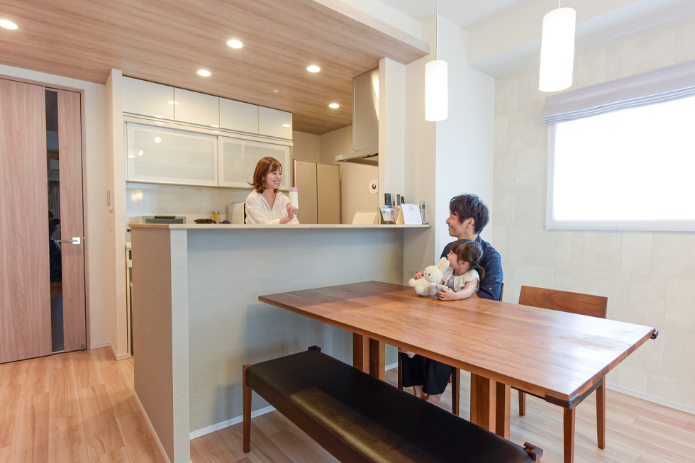 A家がすっきり広々としている理由がもう一つ。それは、アウトフレーム設計です。「以前の住居は柱の出っ張りがあって、置きたいように家具が配置できませんでした。」という奥様、実は間取り図を見たときからこの工法に気が付かれていて、購入の決め手にもなったそうです。ウォールナットの家具が美しく配置された居心地の良いリビングダイニングとキッチンスペースを程良く隔てているのは、少し高めの立上りカウンター。「キッチンの目隠しになるだけでなく、子どもの手が届かない高さなので、リモコンを置いたり、子どもが触ると危ないものをサッと乗せる一時置き場としても重宝しています。」