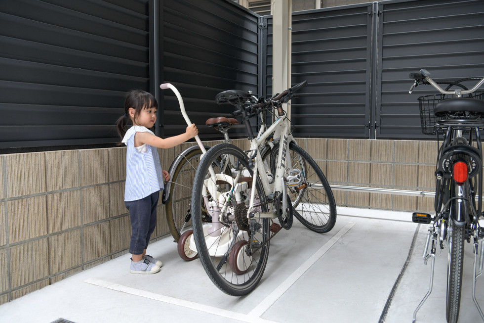 「出し入れしやすい平置きの駐輪場には、3台の自転車を停めています。」