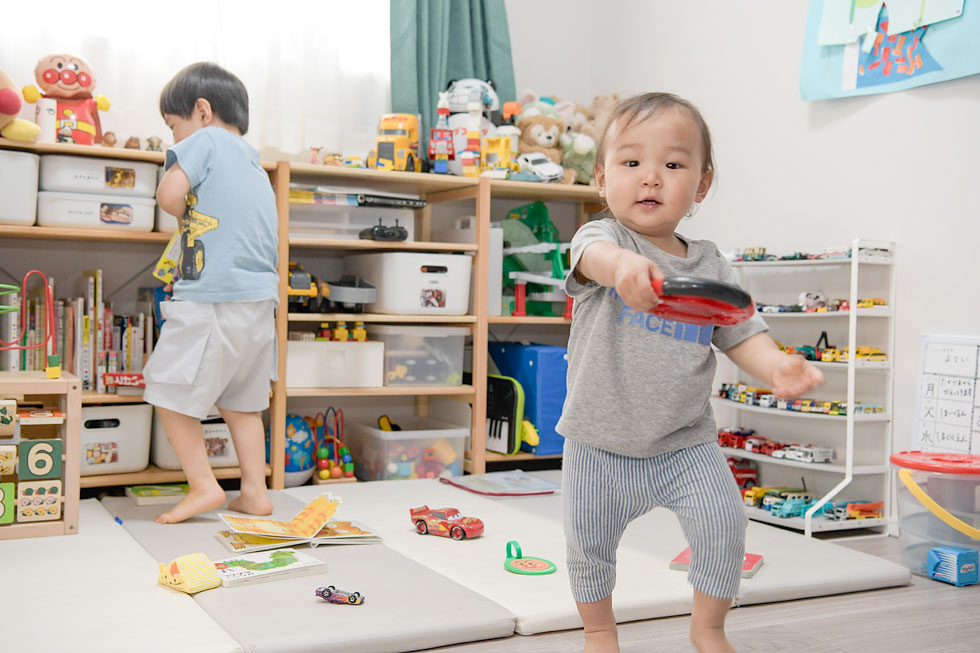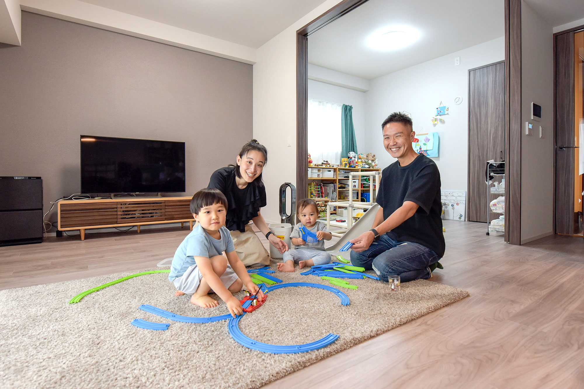 「子供たちがもう少し大きくなるまで、ソファは置かないつもりです。」というK家では、リビングと洋室をつなげた大空間で、お子様たちがのびのびと遊んでいます。「この間取りは、遊んでいる子供たちの様子をキッチンから一目で見渡せるのがいいですね。それから、居室、キッチン、洗面室、お風呂、廊下が、スムーズに行き来できるようにぐるっとつながっているので、家事が効率良くこなせます。」と奥様。機能的な家事動線を確保した回遊性のある間取りは、奥様だけでなく元気いっぱいのお子様たちにとっても嬉しい間取り。行き止まりがなく伸びやかにつながった空間を、ぐるぐると楽しそうに走り廻っています。
