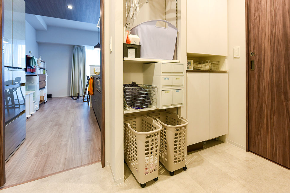 お子様二人とお風呂上がりにゆっくり身支度ができる広々サイズの洗面室は、リネン庫も大容量。「扉付き部分と扉無し部分に分かれているので、扉無し部分に洗濯カゴを置いて、子供が自分で洗濯物を入れられるようにしています。それから居室のクローゼットのほとんどに、ハンガーパイプが上下2本設置されているので、子供の手が届く下のパイプを子供用にしています。」と、お子様の自立心を育てる工夫には見習うところがいっぱい。寝室として使っている洋室の出入り口の引戸も気に入っているそうです。「引戸は家具のレイアウトがしやすいだけでなく、子供を起こさず静かに開け閉めできるので助かります。」