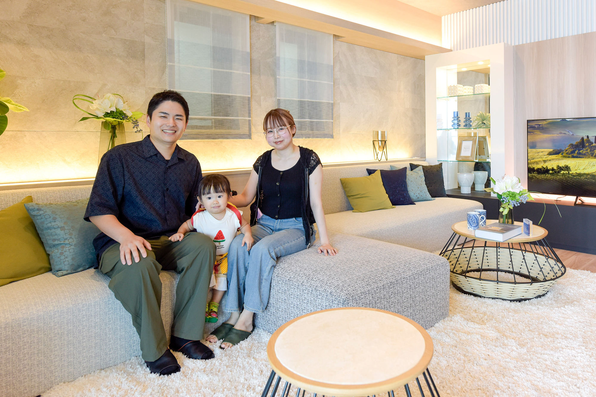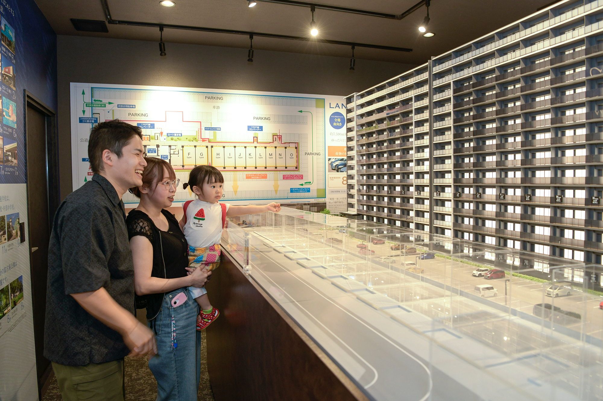 ご入居後に、マンション内の共用施設を利用することが楽しみというH家。「このマンションには映画鑑賞や楽器の演奏などができる防音ルームがあるそうです。まだ子供が小さくて一緒に映画館に行けないので、引越したらこの防音ルームで映画を観たいと思っています。それから、カウンターキッチン付きのマルチルームやキッズスペースもぜひ利用してみたいですね。子供のお友だちも呼んでパーティーをしたら楽しそうです。」広い敷地を活かした全戸分の平置き駐車場や多彩な共用施設が便利で豊かな毎日を育み、堅牢な造りとセキュリティが住まうご家族の暮らしを守る「大規模マンション」という選択。H家のマイホームが完成するのはもうすぐです。