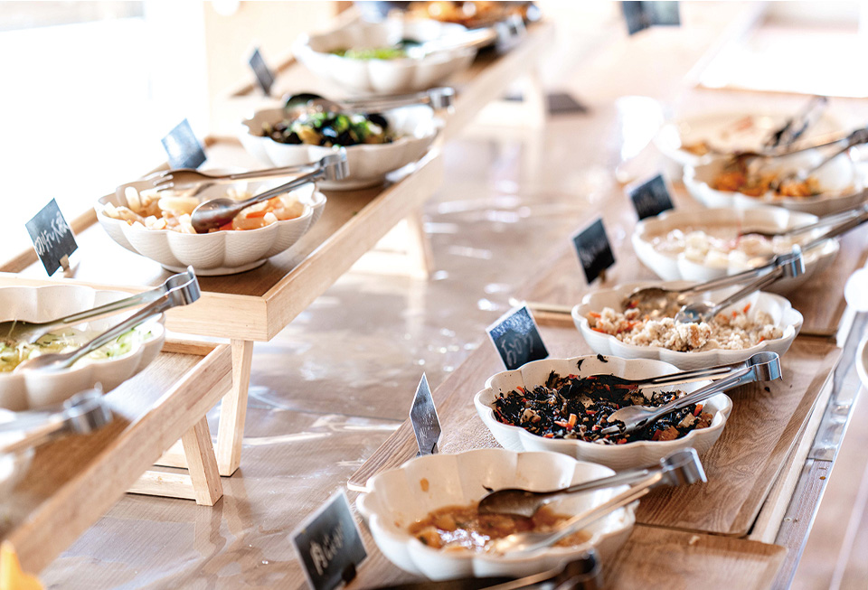 「道の駅たかの」のレストランでは、鮮度の良い野菜本来の「美味しさ」を堪能できるランチバイキングが大人気。鮮やかな野菜料理が並ぶバイキングは品数豊富でどれをチョイスするか迷ってしまいます。