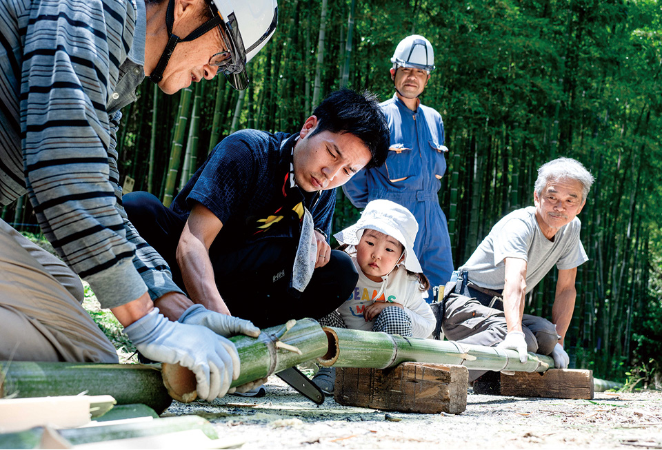 古民家を改装した「宿NAVELの学校」を拠点に、旅を企画した「株式会社空・道・港」のスタッフが島での旅をサポート。隣接するエストニア式サウナ「meri小佐木島」で使用する竹の薪は、参加者と島の人が共同作業で作ります。