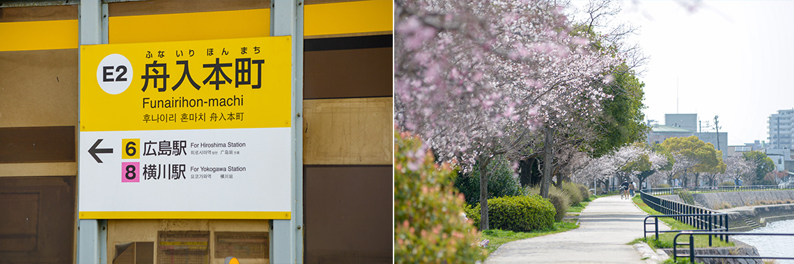 スタート地点は、広島電鉄江波線の「舟入本町」電停。平日は「広島」駅行が78本、「横川」駅行が74本停車し、「紙屋町」までは約15~17分程でアクセスできる便利な電停です。周辺には多彩な買い物施設や飲食店、金融機関、病院などが集結。東側には本川(旧太田川)、西側には天満川が流れ、豊かな自然が四季の移ろいを感じさせてくれます。