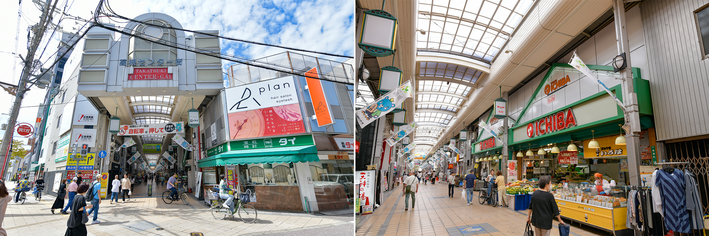 阪急「高槻市」駅とJR「高槻」駅の間には、両駅を結ぶように「高槻センター街」「たかつき中通り」「たかつき本通り」など多数の商店街があり、地元の方々に親しまれています。中でも「高槻センター街」は100年近い歴史を持つ商店街で、全長300mのアーケードに食品、ファッション、雑貨、飲食などバラエティに富む店舗が並び、多くの人で賑わっています。