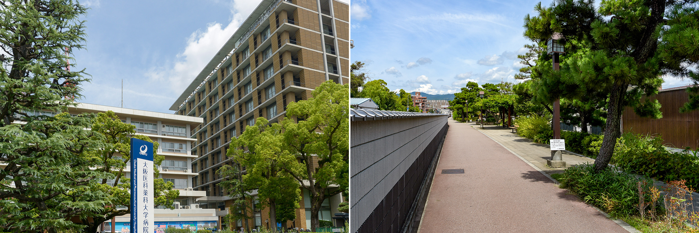 現地の東側には、北摂エリアの地域医療の要として高度な先端医療を行う「大阪医科薬科大学病院」の敷地が広がっています。その東側の府道79号線沿いには、歴史情緒あふれる「松原公園」。散歩に最適な歩道状の都市公園で、江戸時代からの由緒あるクロマツが現在でも56本並んでいます。「第10回みどりのまちづくり賞」で大阪府知事賞を受賞しました。