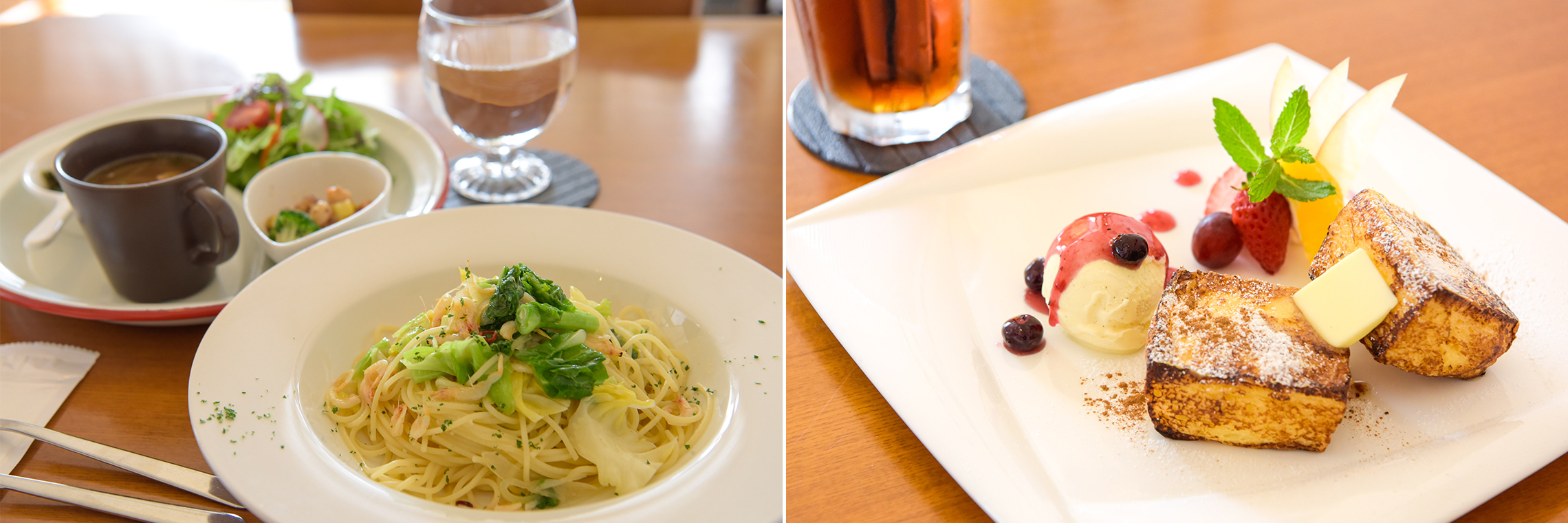 現地すぐ近くの「ダイニングカフェ アンジー」は、民家をリノベーションした隠れ家的カフェレストラン。ランチ・デザートメニューのほか、完全予約制でコースディナーも楽しめます。ご夫婦二人で営むこじんまりとしたお店ですが、驚くほど美味しいお料理と居心地の良い空間、そして素晴らしい接客で、何度でも足を運びたくなる素敵なお店です。