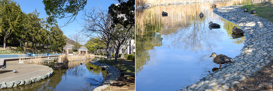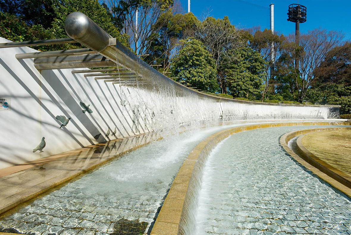 「総合レクリエーション公園」の「虹の広場」は、全長約50mの壁から滝のように水が流れ落ちる「壁泉」が特徴の広場です。夏には水遊びを楽しむたくさんの子どもたちで賑わいます。広場南側の「新長島川親水公園」も水と触れ合える公園。鴨たちの憩いの場となっているこの公園は、スイセンの名所としても知られ、四季折々の花や樹木が楽しめます。